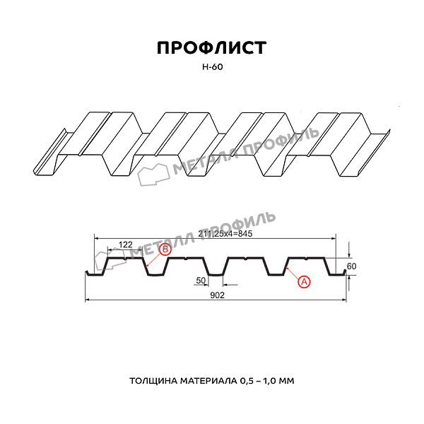 Профлист МЕТАЛЛ ПРОФИЛЬ Н-60x845-A (ECOSTEEL-01-БелыйКамень-0,5) часто используется для обустройства профилированного листа. Представляет собой лист оцинкованной стали с покрытием. Общая толщина металла с оцинковкой и защитно-декоративным слоем — 0.5 мм. После проката на специальном оборудовании металл принимает волнообразный вид. Такая форма придает профилю жёсткость.